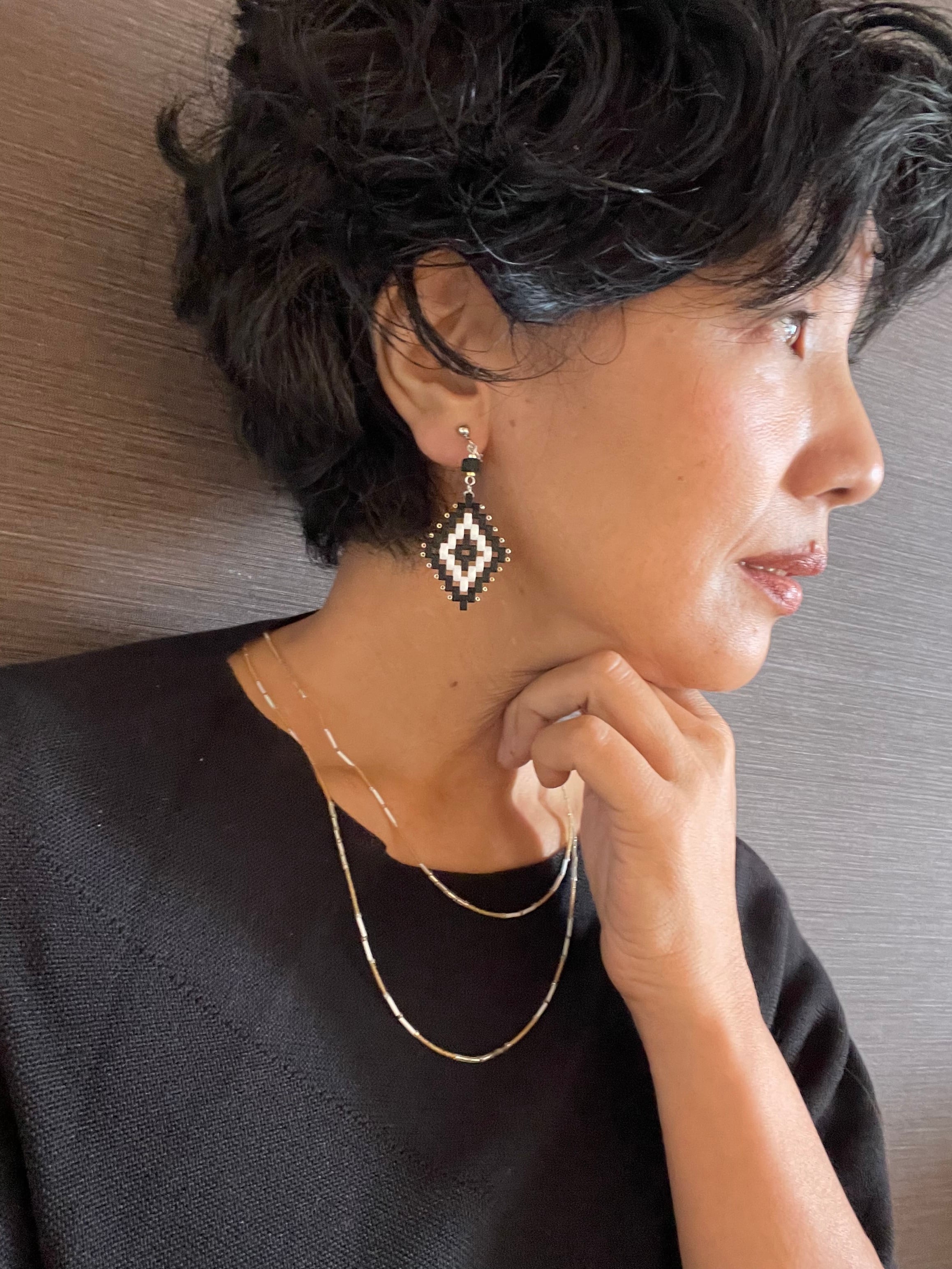 モノトーンをテーマにしたこの耳飾りは、上質なオニキスと美しいビーズで作られており、モダンなデザインが際立っています。シックでありながら、どこか華やかさを感じさせる仕上がりが魅力です。